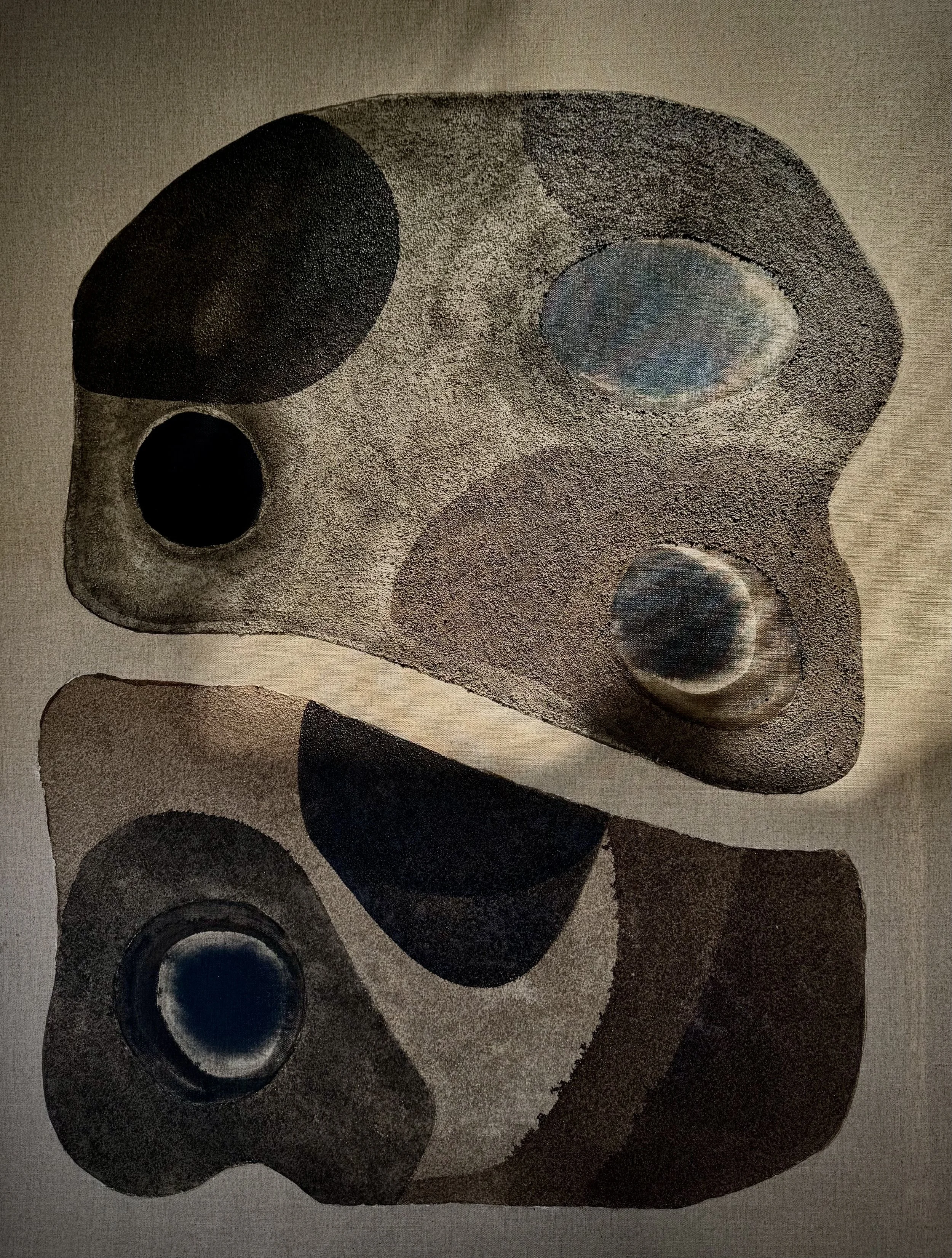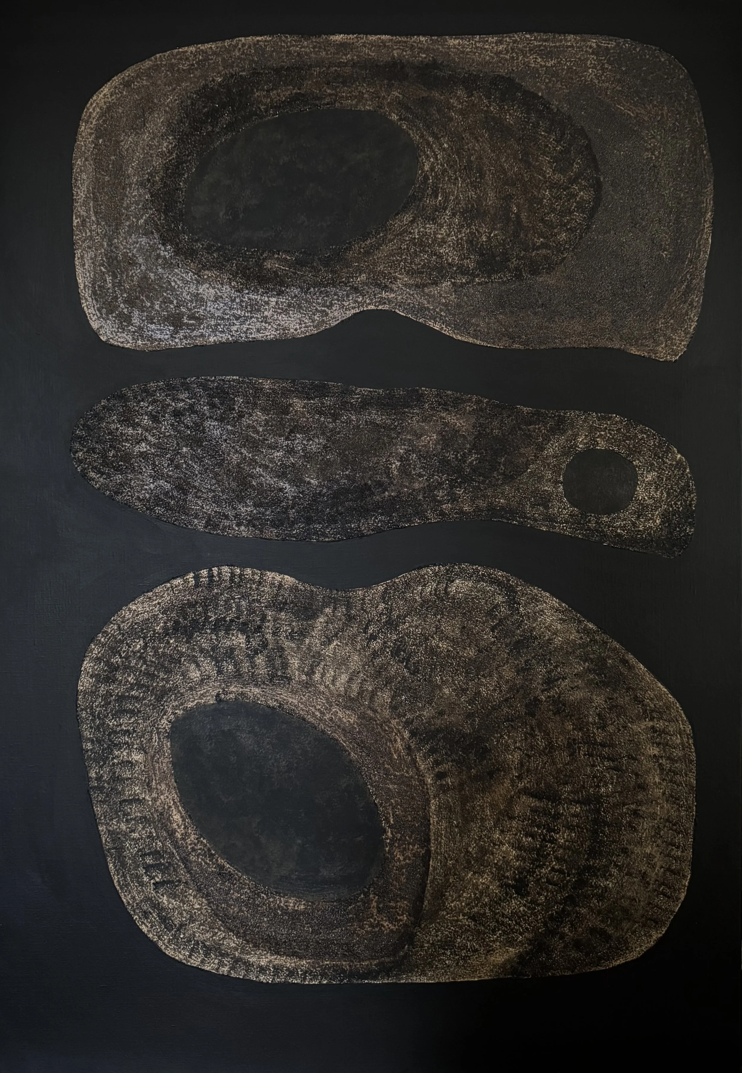J’utilise des matériaux qui dialoguent avec la terre : l’encre de Chine, le brou de noix, la peinture acrylique, et un mélange de plâtre et de marc de café qui donne à mes surfaces une texture brute, granuleuse, presque vivante.